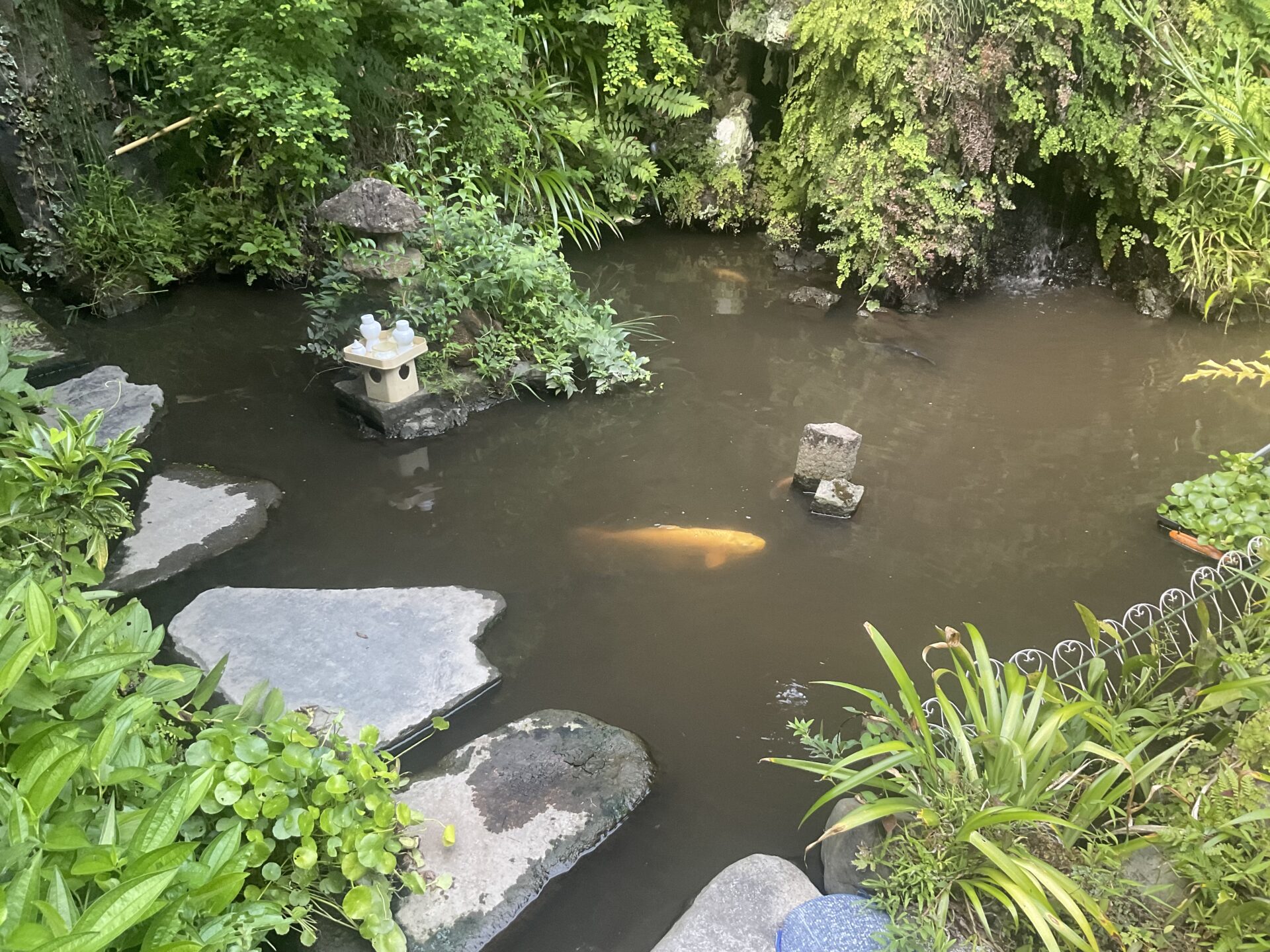 鳥居を抜け階段を上がると本殿と金色に輝く鯉がいる池がありました!
