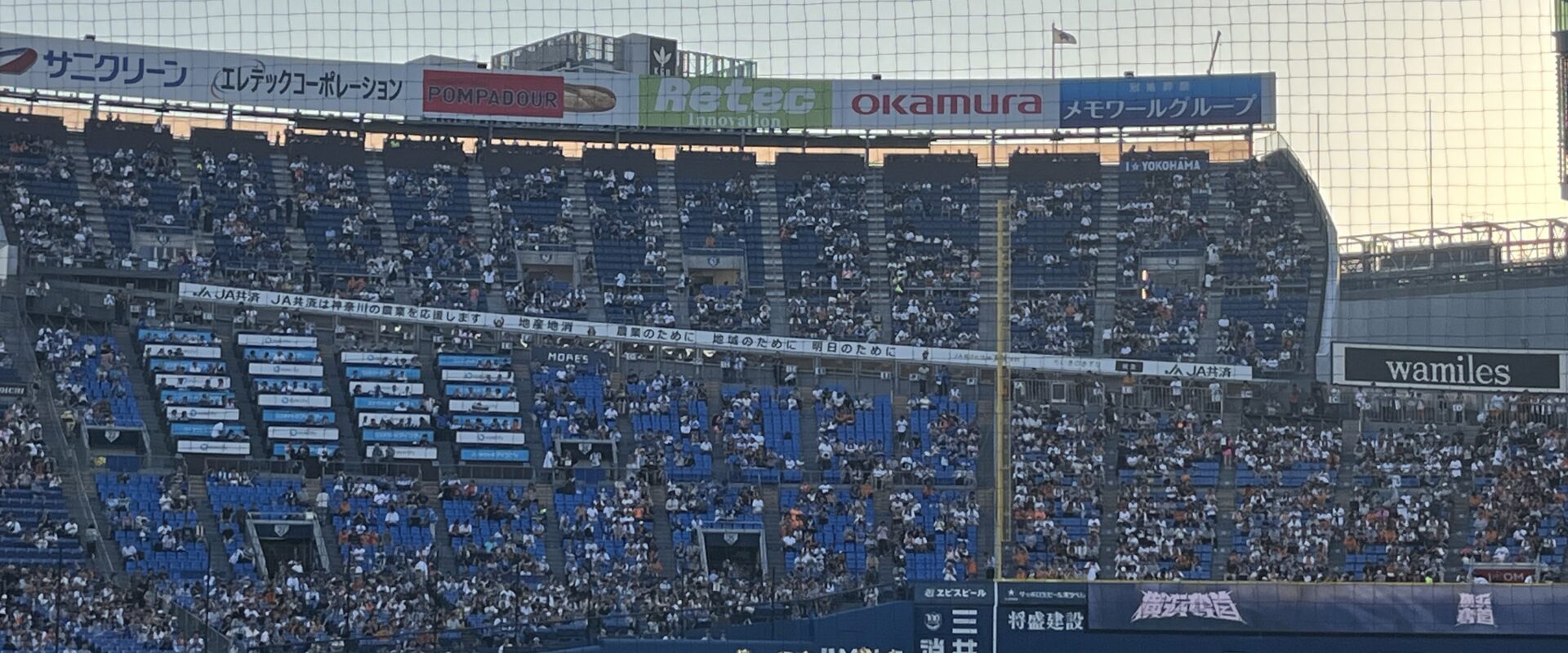 ご存じの方もいらっしゃるかもしれませんが、弊社は横浜DeNAベイスターズのスポンサーを務めております。三塁側の壁面には弊社の広告が掲出されており、一塁側から観戦すると正面に大きくご覧いただけるんです👀✨